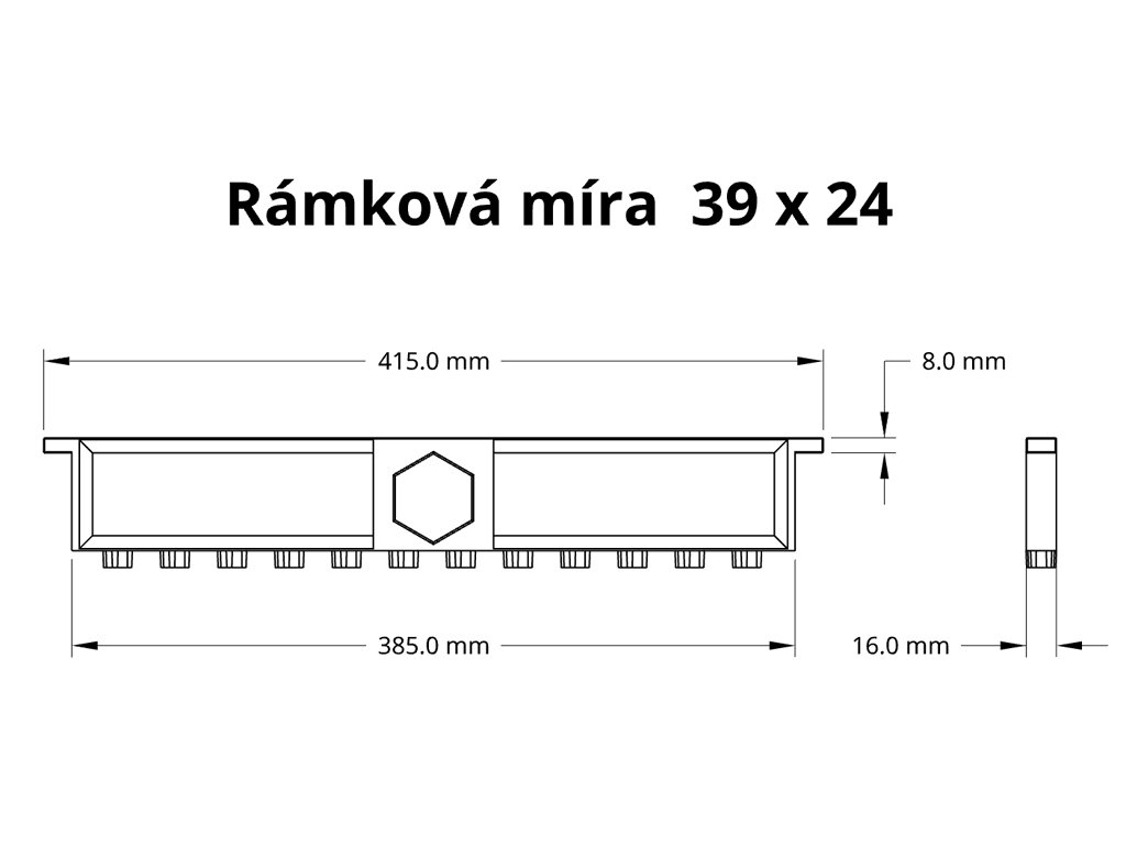 Jedná se o chovný rámek se sníženou horní loučkou, s dírou nad matečníky a na pevno upravenými držáčky na klasický matečník a školkovací klícku typu "natáčka". (školkovací klícky nejsou součástí balení!)